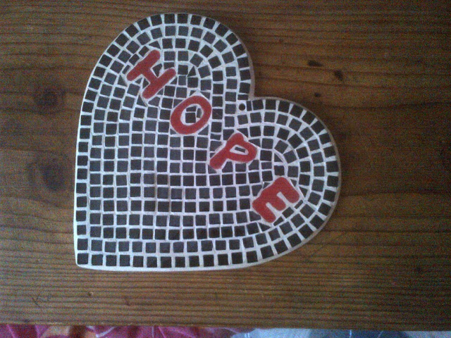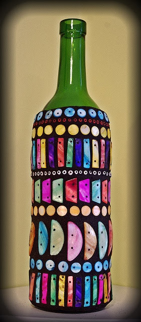 Art, like music, is all around us. Almost anything can be reused and recycled to create a work of beauty. I try to live 'green' and recycle a lot of materials for my crafts. Here are examples of mosaic'd wine bottles that I found on the internet (I'll add pictures of my own mosaic'd bottles in a separate post), which would make great decorations for indoors or outdoors. Smaller glass colddrink bottles come in a lot of different colours and are excellent for making outdoor candle-holders or wind-chimes. A cool idea for glass bottle wind-chimes is to colour them yourself using stained glass paint. You can also mosaic it with light tessarae like shells or small ceramic figures of a light weight.